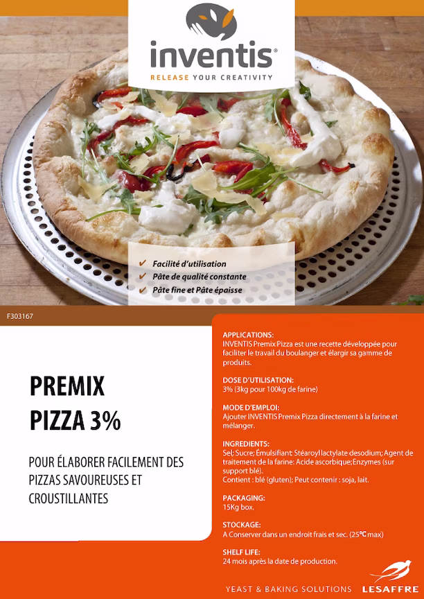 Inventis® Premix Pizza 3% est une solution prête à l’emploi pour des pâtes à pizza authentiques et savoureuses, conçue pour les professionnels recherchant rapidité, régularité et résultat de qualité supérieure.
