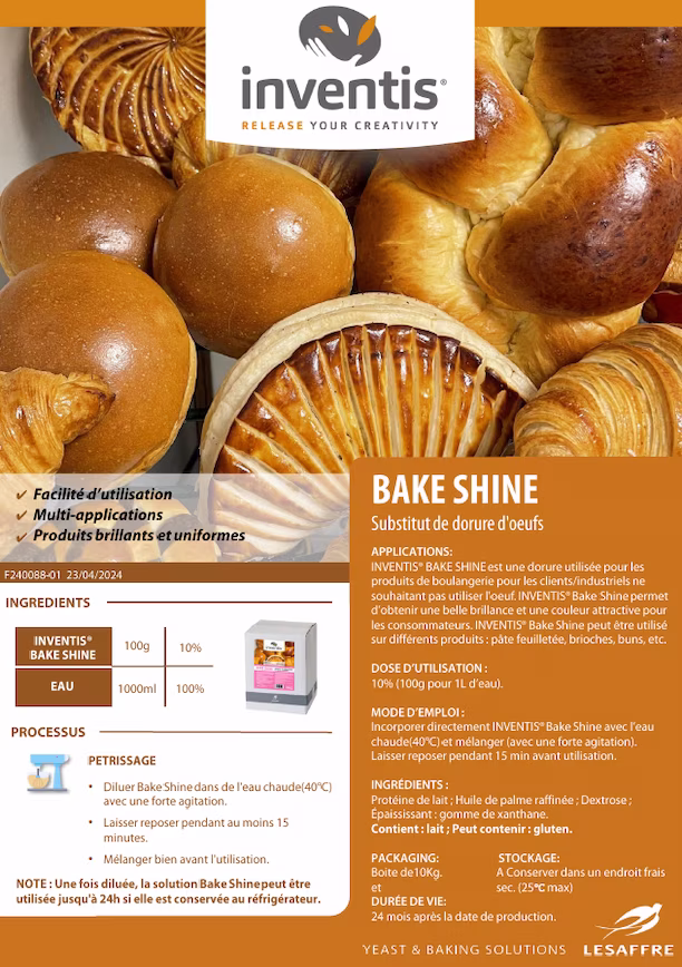 Grâce à sa formulation unique, Inventis® Bake Shine donne une belle brillance et une couleur attrayante sur une variété de produits de boulangerie comme les brioches, les petits pains, les viennoiseries…