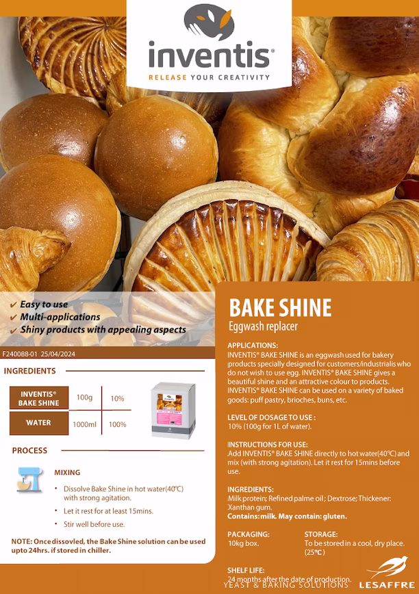 Inventis® Bake Shine is an eggwash replacer used for bakery products. It is specially designed for industrials who do not wish to use egg in this production.