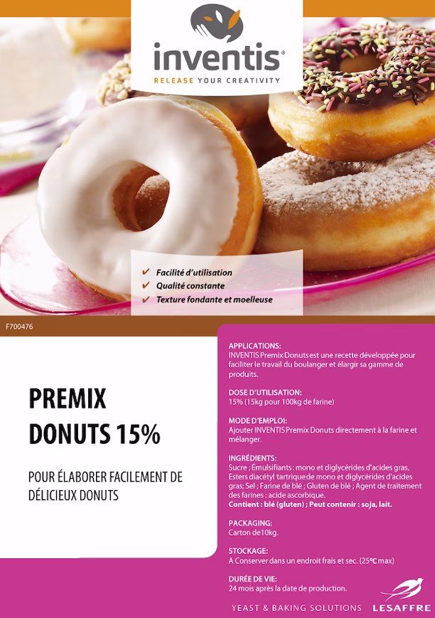 Inventis® Premix Donuts 15% is a ready-to-use solution for making soft, consistent doughnuts, designed for professionals seeking speed, simplicity and consistent quality in their production.